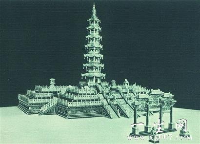 上海“粹华轩”携“翠玉宝塔”参展,引人注目。塔分七级,式样仿上海的龙华古塔,高约50英寸,底座对径长约13英寸,重约75磅。台阶三级堆高,四周绕以翠雕栏杆,是北京故宫太和殿台阶翻版。