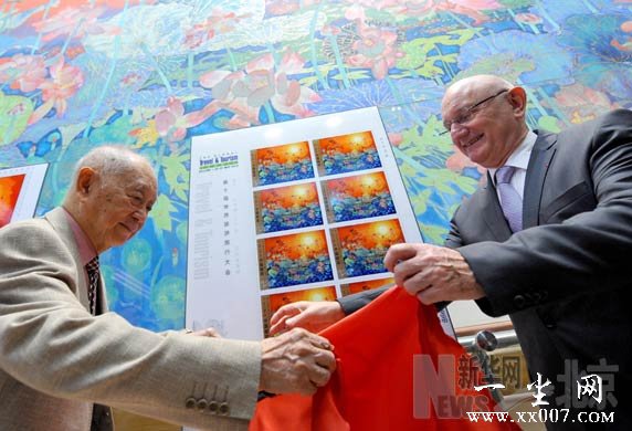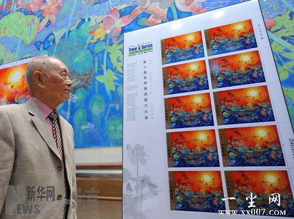 5月25日,著名画家黄永玉在欣赏根据他的画作《荷》设计的邮票。当日,中国邮政发行“第十届世界旅游旅行”纪念邮票一套一枚。邮票图案是著名画家黄永玉为北京荣宝斋大厦捐献的巨作《荷》。