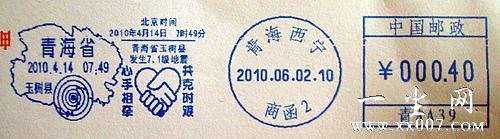 为此,西宁和玉树分别启用纪念戳一枚,青海省首次启用的邮资宣传戳图,这台机器是湘邮科技赠送给玉树的,由于玉树没有使用条件,因此放在青海省广告商函公司使用,并在玉树地震“七七”日今日正式启用。